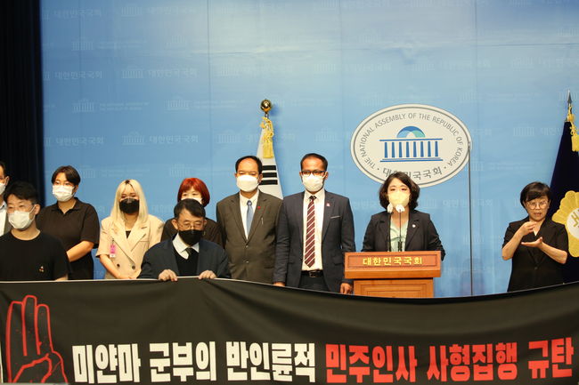 용혜인 기본소득당 의원, 미얀마 민족통합정부(NUG) 한국대표부, 미얀마 민주주의를 지지하는 한국시민사회단체모임, 미얀마 민주주의네트워크 등은 28일 국회에서 `미얀마 군부 민주인사 사형집행 규탄`기자회견을 열고 미얀마 군부정권을 규탄했다.주최 측은 이날 발표한 기자회견문에서 “천인공노할 미얀마 군부의 사형집행을 규탄한다”며 “미얀마 군부의 사형집행을 막기 위해 힘을 모으자”고 했다.