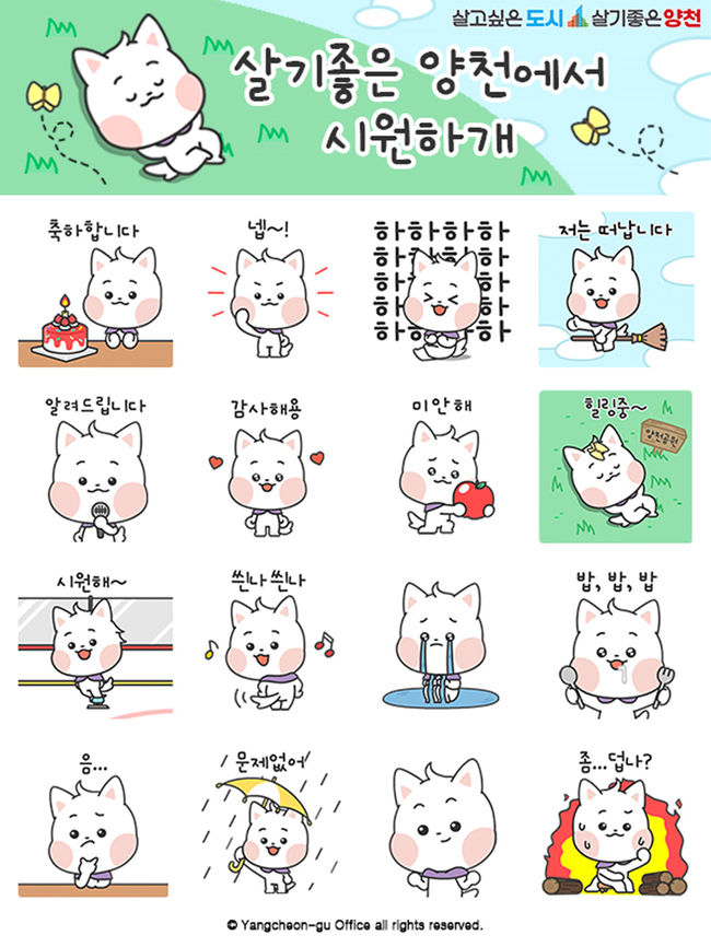 이를 위해 구는 여름을 맞아 ‘살기좋은 양천에서 시원하개(犬)’를 주제로 구의 마스코트인 강아지 ‘해우리’를 활용해 모든 연령층이 공감할 수 있고 일상생활에서 유용하게 사용할 수 있는 16종의 움직이는 이모티콘을 제작했다. 특히 여름의 계절감을 반영해 청량한 색상을 활용했으며, 구의 주요 명소인 양천공원 등을 배경으로 재치 있는 문구와 동작을 디자인했다.