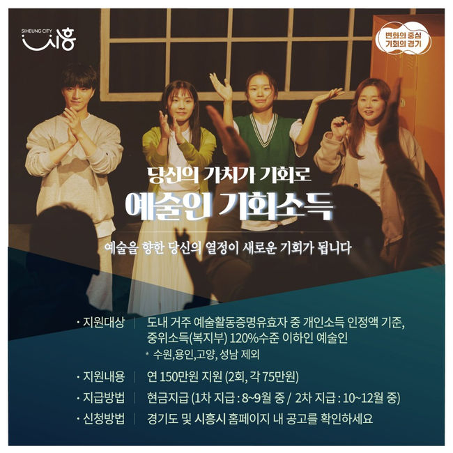 시흥시가 경기도와 공동으로 추진하는 ‘예술인 기회소득’ 사업 신청을 7월 24일부터 받는다고 밝혔다.