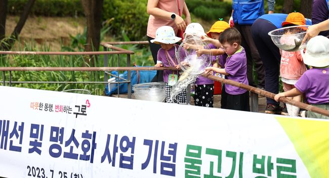 문헌일 구청장을 비롯해 시의원, 구의원, 지역주민들은 공원을 둘러보고 지난 4월 재정비를 마친 생태연못에 물고기 3종을 방류하는 시간을 가졌다.
