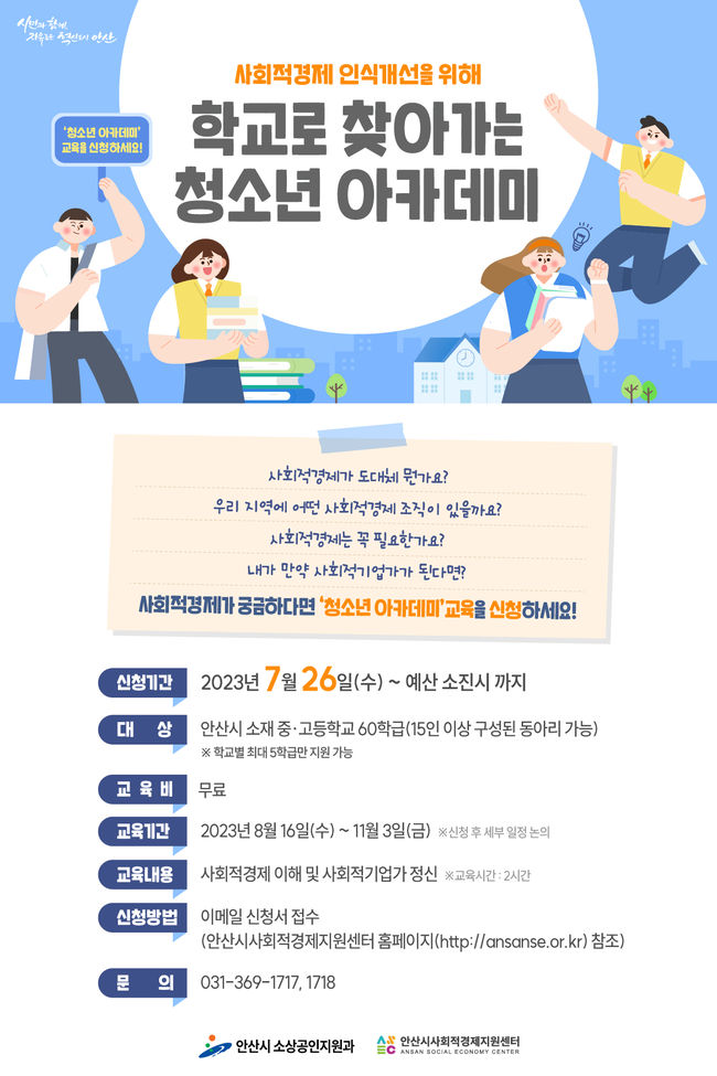 안산시는 26일부터 청소년들의 사회적경제 인식개선을 위한 ‘학교로 찾아가는 청소년 아카데미’ 수강대상자를 모집한다고 밝혔다.