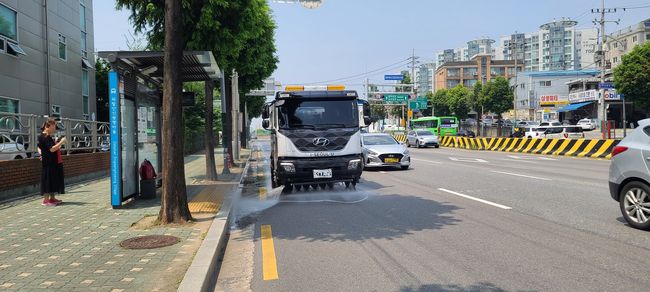 체감온도가 높은 낮 시간대에는 도심 열섬 현상을 완화하기 위해 살수차를 집중 투입하고 있다.