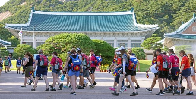 새만금 잼버리 대회에 참가한 영국 스카우트 대원들이 8일 서울 청와대를 관람하고 있다.