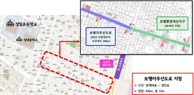 구는 차량과 보행자의 통행이 많아 안전사고 위험이 높았던 성일초등학교 통학로 (양재대로89길)를 보행자우선도로로 신규 지정하고, 보행자 우선도로이지만 노후된 명일초등학교 통학로(고덕로38길)도 재포장 대상으로 지정했다.