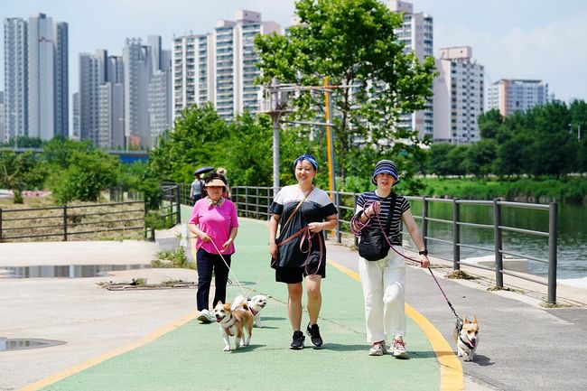 중랑천에서 반려동물과 산책 중인 중랑구민
