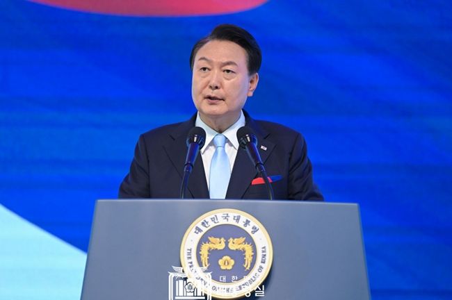 윤석열 대통령이 8월15일 오전 이화여대 대강당에서 열린 `제78주년 광복절 경축식`에 참석하여 경축사를 하고 있다.