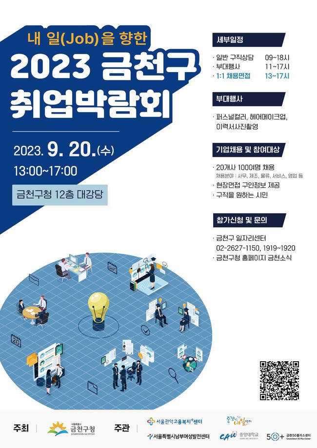 금천구는 9월 20일 우수한 직원을 채용하려는 기업과 양질의 일자리를 찾고 있는 구직자를 위해 ‘내 일(Job)을 향한 2023 금천구 취업박람회’를 개최한다고 밝혔다.
