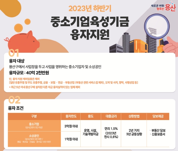 박희영 용산구청장은 “중소기업육성기금 융자는 일반은행보다 낮은 대출금리로 지원하지만 올해 한시적으로 0.8%의 저리로 지원할 것”이라며 “경기 침체와 금리 상승으로 경영난을 겪고 있는 중소기업과 소상공인들에게 체감할 수 있는 도움이 되길 바란다”고 말했다.
