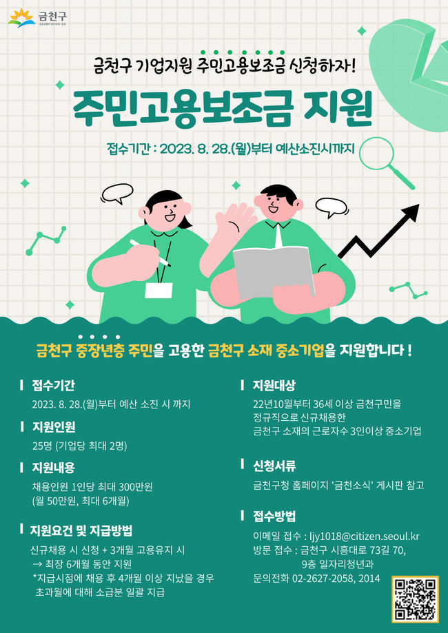 금천구는 36세 이상 금천구민을 정규직으로 채용하고, 3개월 동안 고용을 유지한 금천구 소재 중소기업(근로자 수 3인 이상)에 주민고용보조금을 지급한다.