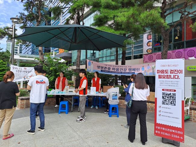 구로구는 지난 5일 구로디지털단지에서 생명사랑 캠페인을 벌이고 직장인을 대상으로 자가마음검진과 상담 부스를 운영했다.
