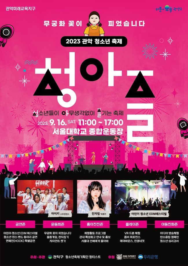 관악구가 오는 9월 16일 서울대학교 종합운동장에서 2023년 관악 청소년 축제 ‘제2회 청아즐: 무궁화 꽃이 피었습니다’를 개최한다고 밝혔다.