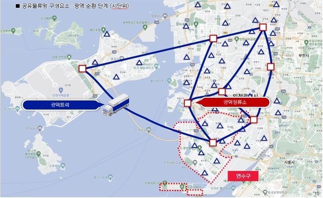 인천광역시는 공유물류망을 통한 당일배송 서비스를 8월부터 연수구에서 시범 운영한다고 밝혔다. 이미지는 광역 및 지역 물류망 구축계획
