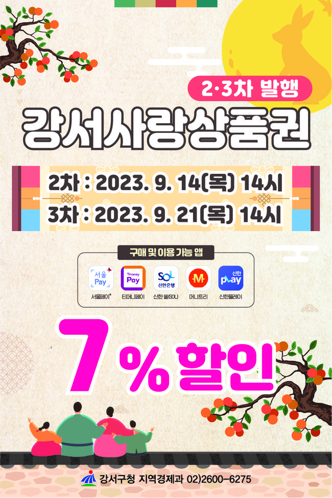 구 관계자는 “민족대명절 추석을 맞이해 소비자와 판매자 모두가 웃을 수 있도록 매년 인기리에 완판 행진을 이어가는 서울강서사랑상품권을 큰 규모로 추가 발행한다”라며 “소상공인 지원과 소비 촉진으로 지역 경제 활성화에 기여할 수 있도록 적극 노력하겠다”라고 말했다.