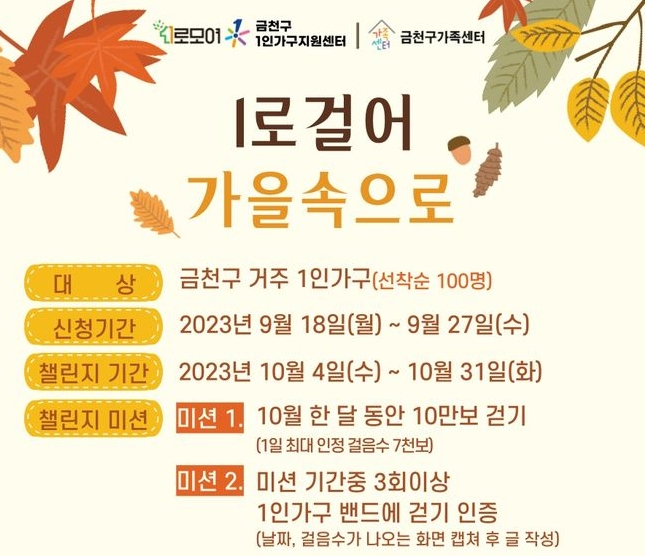 금천구(구청장 유성훈)는 금천구 1인가구 지원센터(이하 센터)에서 10월 한 달간 1인가구 걷기 대회 ‘1로걸어 가을속으로’를 진행한다고 밝혔다.