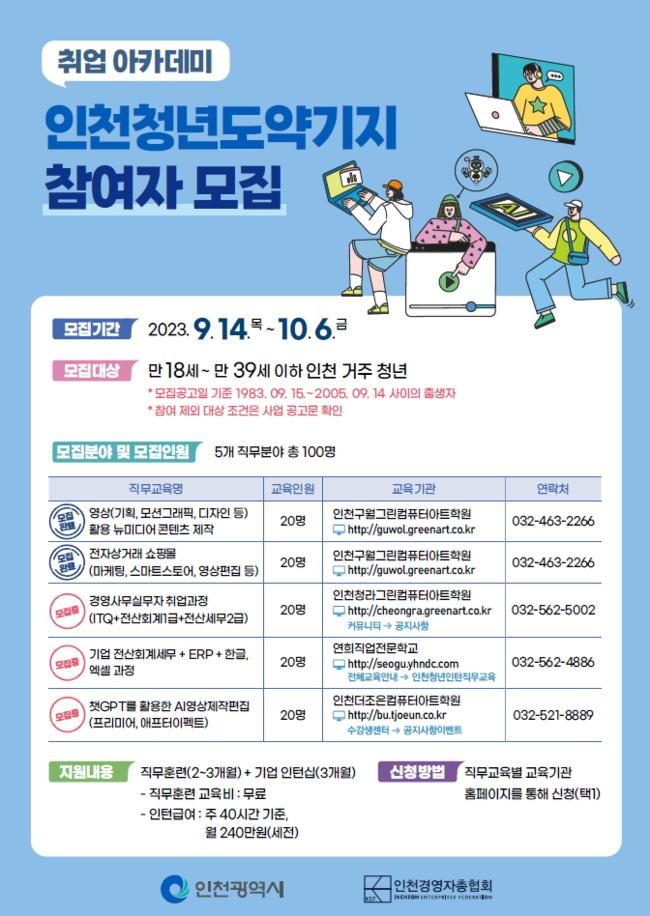 인천광역시와 인천경영자총협회는 인천 거주 구직 청년의 직무능력 향상과 일 경험 축적을 위한 ‘인천 청년도약기지’사업의 참여자를 오는 10월 6일까지 모집한다고 밝혔다.