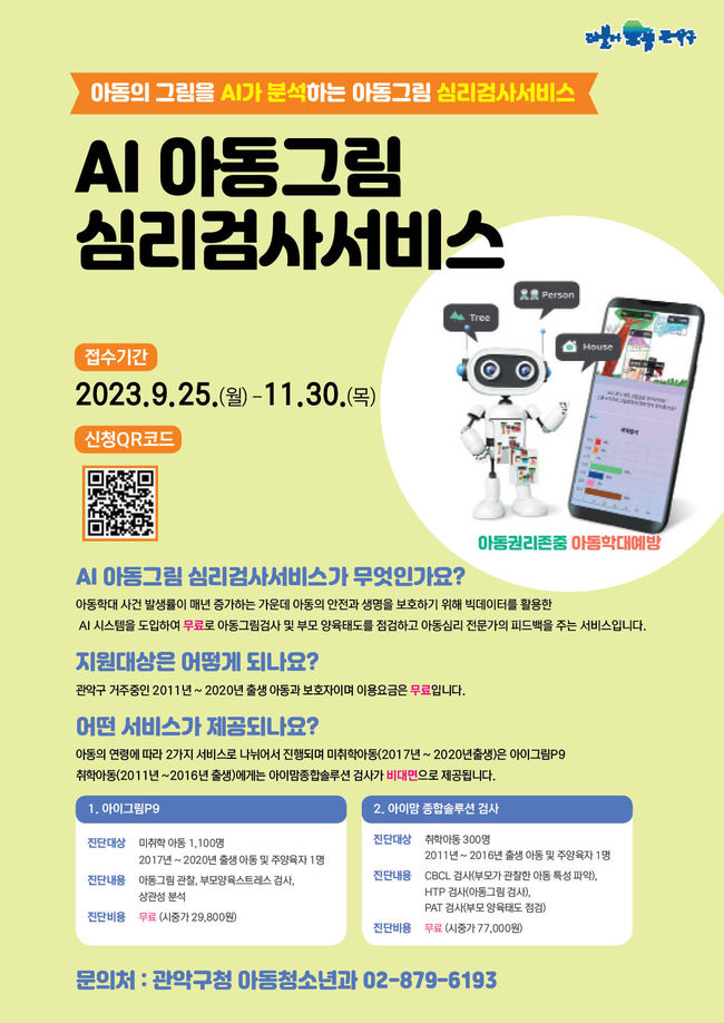 이에 관악구(구청장 박준희)는 효과적인 아동학대 예방책 마련을 위해 빅데이터를 활용한 인공지능(AI) 시스템을 도입, 「AI 아동그림 심리검사서비스」를 운영하고 아동학대 예방에 총력을 기울인다.