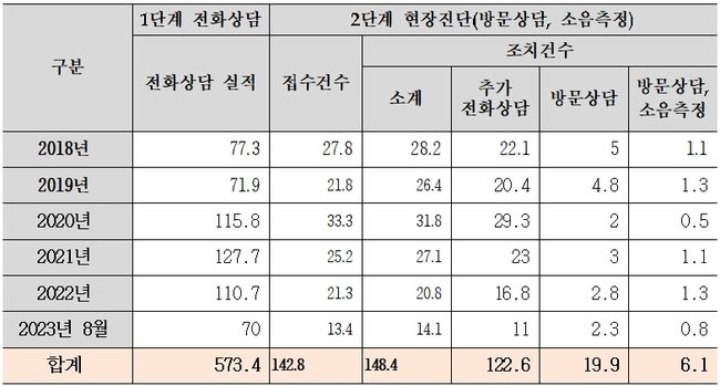 환경부 산하 한국환경공단에서 운영하는 층간소음 이웃사이센터에 접수되는 전화상담도 ▲2019년 71.9건 ▲2020년 115.8건 ▲2021년 127.7건 ▲2022년 110.7건으로 하루 평균 100건이 넘었다.