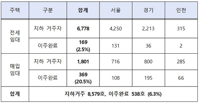 전세임대 지하가구 중 이주 완료 현황은 서울 4,250가구 중 131가구, 경기 2,213가구 중 36가구, 인천 315가구 중 2가구였고, 매임임대 지하가구 중 이주 현황은 서울 716가구 중 108가구, 경기 800가구 중 195가구, 인천 285가구 중 66가구였다.