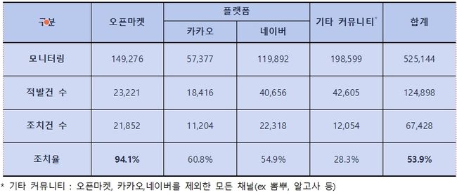 그러나 오픈마켓 23,221건, 카카오 18,416건, 네이버 40,656건, 기타 커뮤니티 42,605건으로 총 124,898건을 적발한 것에 비해 조치 건수는 오픈마켓 21,852건, 카카오 11,204건, 네이버 22,318건, 기타커뮤니티 12,054건으로 67,428건으로 조치율은 절반인 평균 53.9%에 그쳤다.