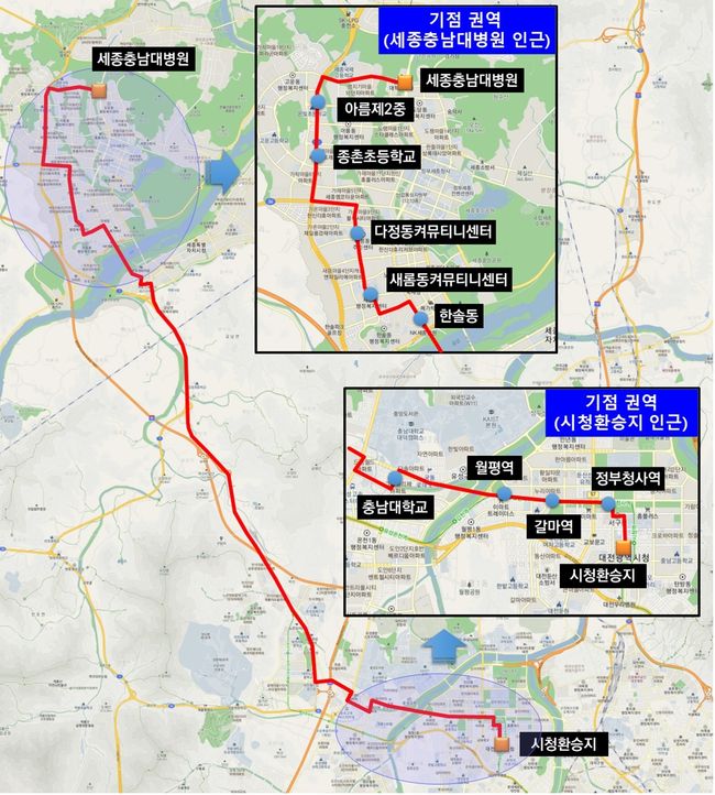 세종-대전 M버스 노선 운행도
