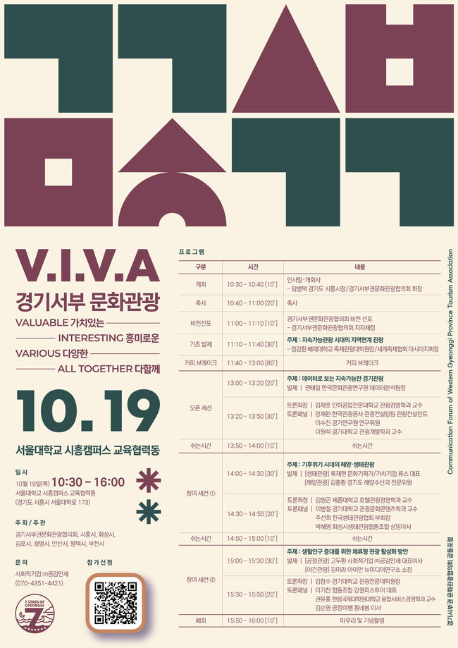 시흥시는 오는 19일 서울대학교 시흥캠퍼스 교육협력동에서 경기서부권문화관광협의회 공동포럼인 V.I.V.A(valuable 가치있는, interesting 흥미로운, various 다양한, all together 다함께) 경기서부문화관광을 개최한다.