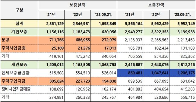 ‘분양보증’은 21년 71조 2천억에서 23년 27조 3천억 원으로, ‘주택사업금융(PF등)’21년 2조 5천억 원에서 23년 1조 7천억 원으로 줄었으며, 개인 보증인 주택구입자금 보증 또한 21년 30조 6천억 원에서 23년 19조 5천억 원으로 줄었다.