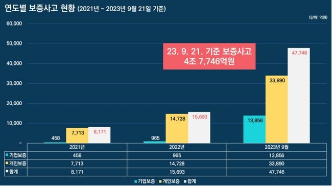 보증사고는 개인과 기업 모두 크게 늘어 개인은 21년 7,713억 원에서 23년 3조 3890억 원으로, 기업의 경우 458억 원에서 1조 3,856억 원으로 늘어났다. 전세 사기, 금리 인상, 건설경기 악화, 경기 침체 등으로 인해 보증사고가 급증한 것으로 나타났다.