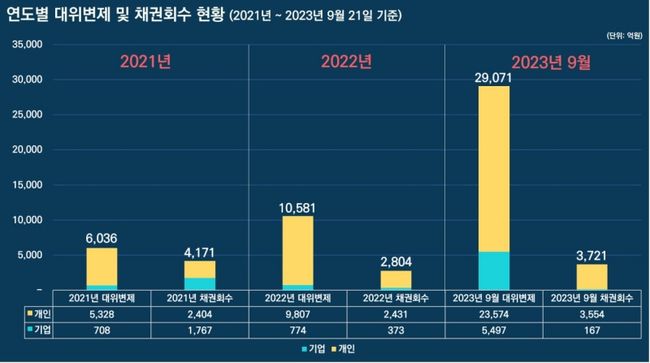 대위변제가 이뤄짐에 따른 채권회수는 21년 4,171억 원, 22년 2,804억 원, 23년에는 3,721억원인데 기업의 회수율이 21년 1,767억 원이었던 반면, 23년에는 167억 원에 불과해 비율로는 기업을 대상으로 한 대위변제에 대한 채권회수율이 더 떨어지는 것으로 나타났다.