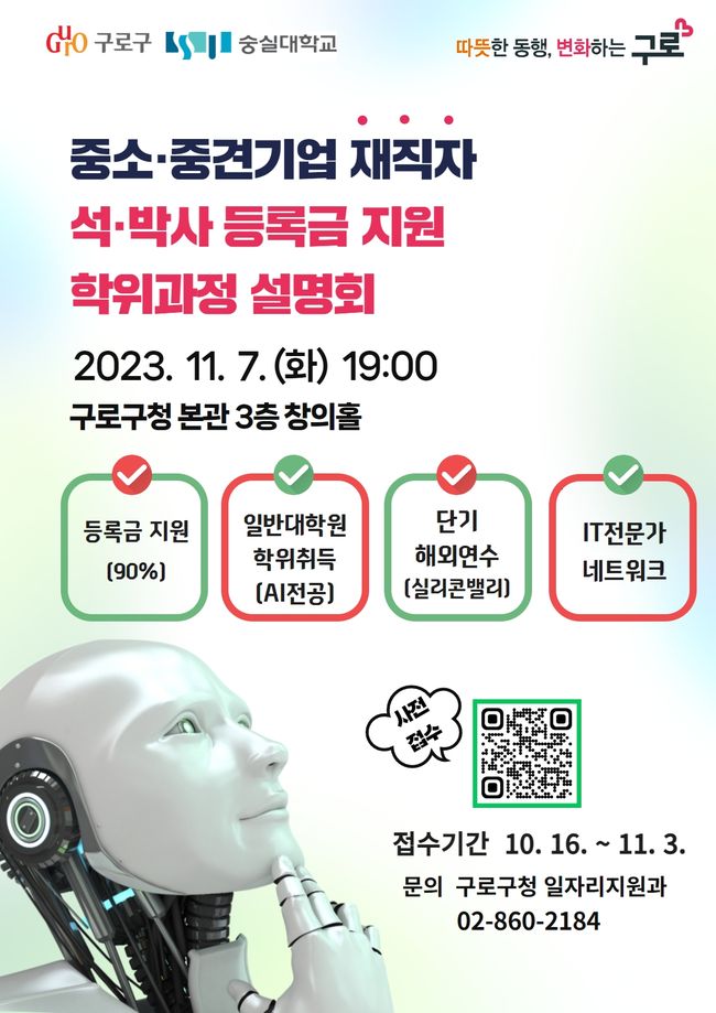구는 민선8기 공약사항인 ‘G밸리 서남권대학 연계 산학 R&D 거점 육성’의 일환으로, 구로구 소재 중견․중소기업에 재직 중인 근로자가 숭실대 AI융합테크노학과 석․박사 과정에 지원하는 경우 1인당 연간 1천만원 이내의 등록금을 지원하고 있다.