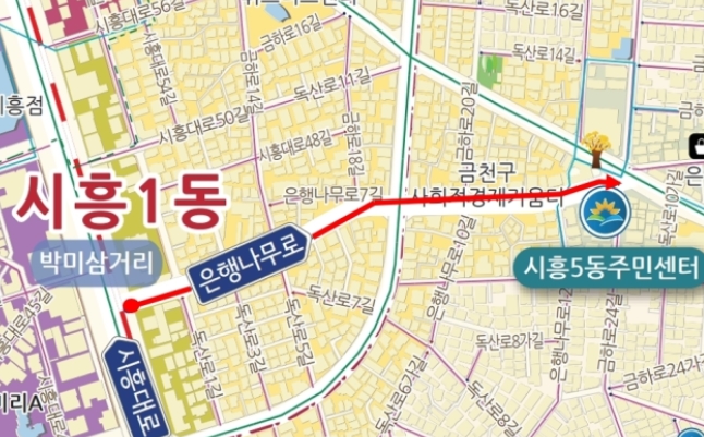 금천구는 정조대왕의 애민정신과 효심을 기리기 위해 은행나무로(백산주유소~시흥5동주민센터, 약579m) 전 구간에 명예도로명 ‘시흥행궁길’을 지정했다.