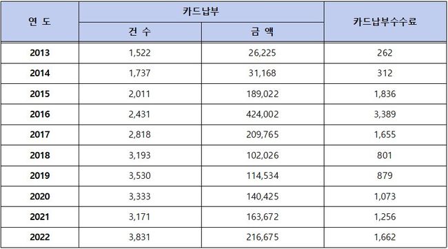 연도별로 보면 2020년 1천73억원, 2021년 1천256억원, 2022년 1천662억원 등이다. 연간 300억원 내외였던 카드 결제 수수료는 건당 1천만원 이하 국세만 세금으로 낼 수 있도록 한 한도 규정이 2015년 폐지되면서 큰 폭으로 늘기 시작했다. 한도 폐지 직후 카드사 혜택도 한시적으로 제공되면서 2016년 3천389억원까지 늘어났지만 2018년 801억원으로 낮아진 뒤 매년 증가 폭을 키우고 있다.