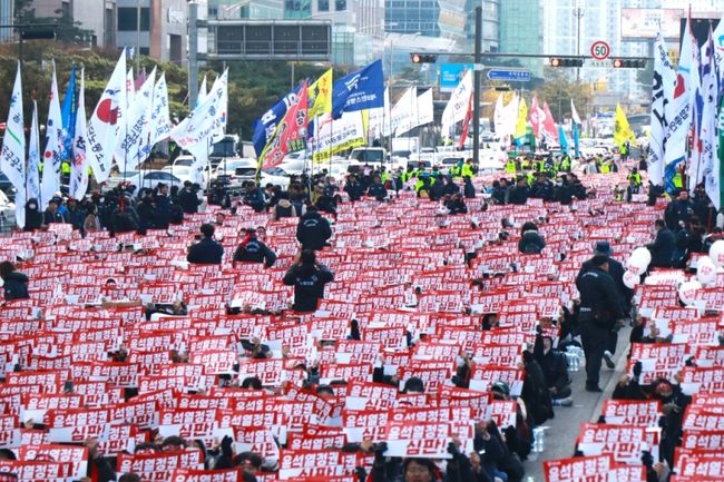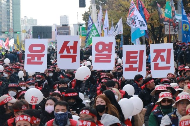한국노동조합총연맹(한국노총)과 전국민주노동조합총연맹(민주노총)이 11일 윤석열 정권 퇴진과 대정부 투쟁을 결의하는 대규모 도심 집회를 개최했다.