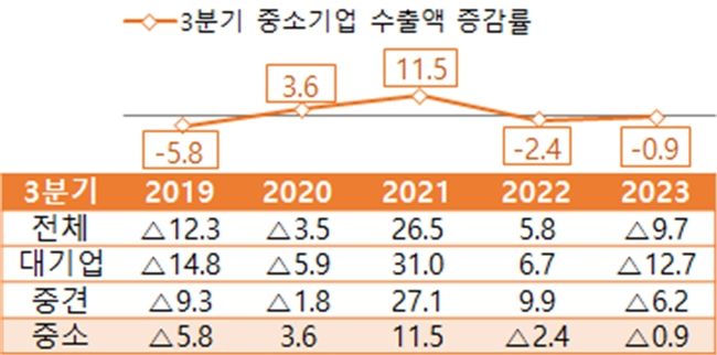3분기 중소기업 수출(△0.9%)은 대기업(△12.7%) 및 중견기업(△6.2%)과 비교할 때 상대적으로 적은 폭으로 감소하며 총수출(△9.7%) 감소세 완화에 기여했다.