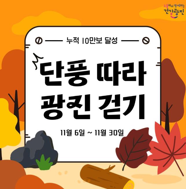 참여 방식은 총 2장의 사진을 올리면 된다. 지역 내 단풍길에서 산책 중인 모습과, 누적 걸음 수 10만 보를 기록한 인증 사진을 ‘광진구보건소 운동교육실’ 카카오톡 채널에 전송하면 된다.