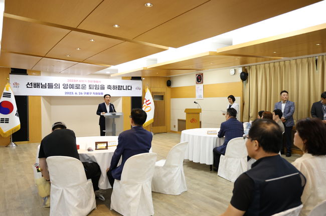 2023년 상반기 정년 퇴임식 행사에서 문헌일 구청장이 인사말을 하고 있다.