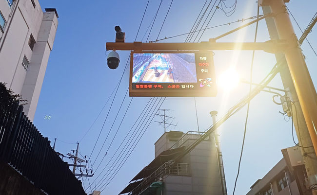 먼저, ‘스마트 교통사고 예방 시스템’을 도입했다. 운전 차량 접근 시 알림 등을 전광판에 표출하는 스마트 AI 시스템이다. AI 카메라가 후방 50m까지 자동차, 보행자 등 객체를 인식해 전광판으로 운전자에게 골목길 상황을 알려준다. ‘차량 접근중 주의’, ‘진입 시 감속하세요’ 등 문구 출력으로 운전자의 사각지대 시야 확보를 크게 개선해 전용보도 설치가 어려운 선곡초등학교 통학로 위험을 대폭 줄였다.