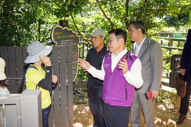 배봉산 맨발황톳길에서 민원 청취하는 이필형 동대문구청장