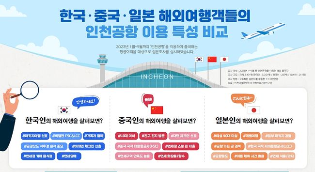 인천국제공항공사 공항산업기술연구원은 급속히 다변화되는 승객들의 니즈에 선제적으로 대응하기 위해 실시한 ‘2023 한・중・일 여객 인천공항 여객 이용특성 조사’결과를 29일 발표했다.
