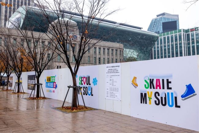 가림벽을 따라 걷다 보면, 겨울철 도심 명소로 자리잡은 서울광장 스케이트장 개장을 야심차게 준비한 서울시의 마음을 재치있게 전달한 문구(▲“스케이트 폼 미쳤다. 소울충만 서울광장” ▲“요금은 단돈 천원, 낭만은 계산 불가” ▲ “겨울엔 육개장도 좋지만 서울광장 스케이트장 개장”)들이 시민들의 시선을 사로잡는다.