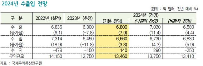 보고서에 따르면, 2024년 우리 수출은 전년 대비 7.9% 증가한 6,800억 달러, 수입은 3.3% 증가한 6,660억 달러, 무역수지는 140억 달러 흑자를 달성할 것으로 전망된다.