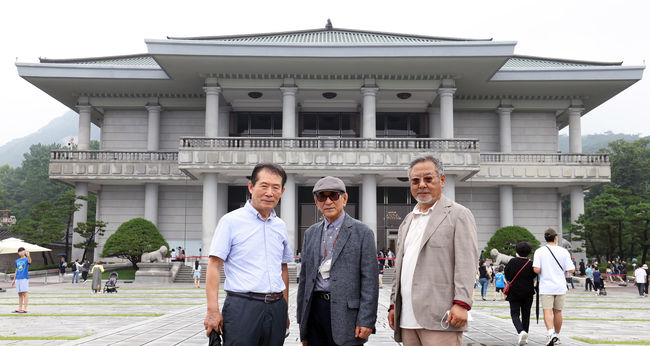 청와대 영빈관 앞에서 오용길 작가,장학구 관장,허달재 이사장(왼쪽부터)