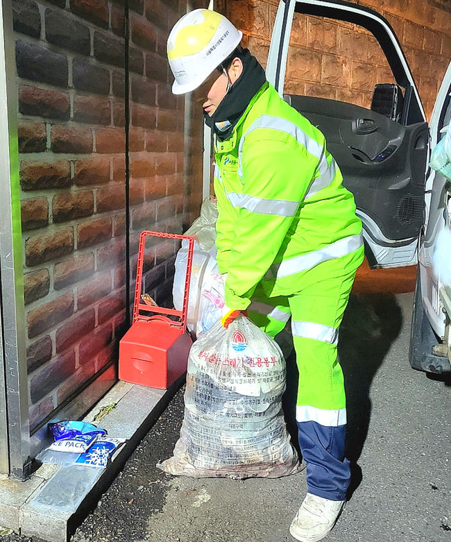 불연성쓰레기가 담긴 50리터 특수마대봉투 수거 중인 양천구 환경미화원의 모습