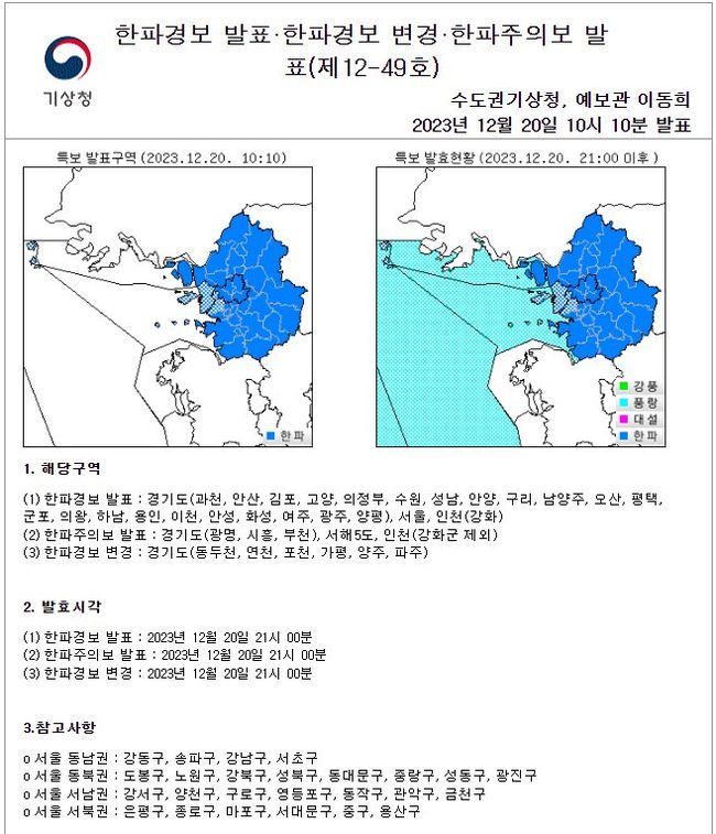 한파경보 발표현황 (2023.12.20(수) 21:00)
