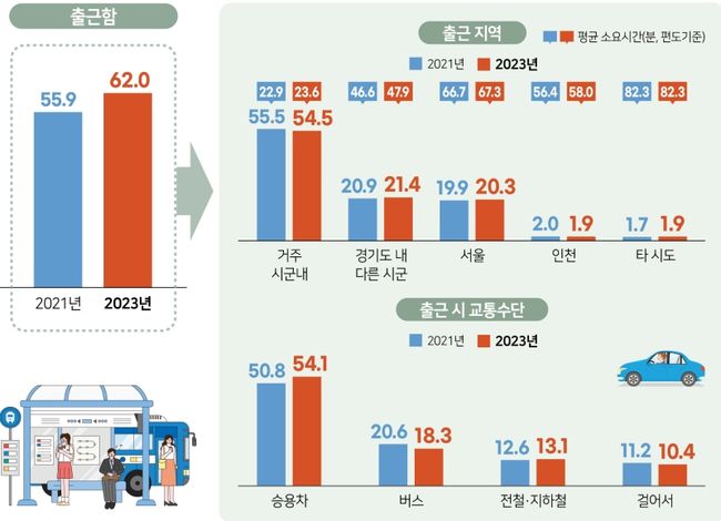출근 시 주로 이용하는 교통수단은 승용차(54.1%)였으며, 대중교통 이용은 31.4%(버스 18.3%, 전철·지하철 13.1%)로 조사됐다.