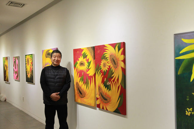 캔버스 전체를 가득 메운 노란 해바라기 꽃잎과 씨앗은 생생한 전달력으로 감상자의 시선을 단번에 사로잡을 만큼 인상적이며, 특히 붉은색 배경의 노란 해바라기는 정열적 분위기로 전시장 전체에 활력을 불어 넣는다.