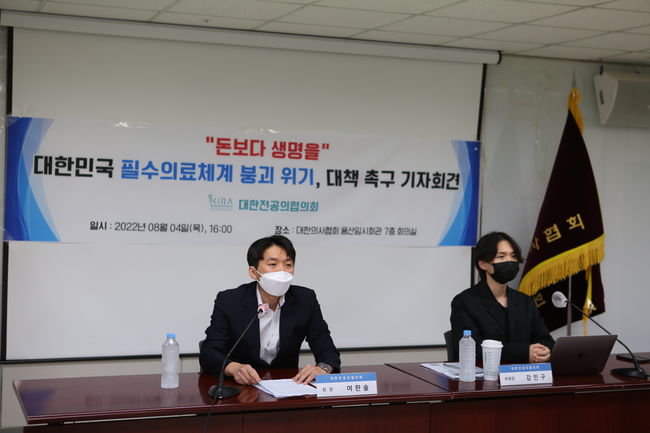 대한전공의협의회는 4일 대한의사협회 희의실에서 `의료체계 붕괴 대책 촉구 기자회견`을 가졌다.전공의협의회 여한솔 회장은 "현재 정부와 의사협회가 협의체를 통해 필수의료 처우 개선을 논의하고 있지만, 근본적인 부분들은 하나도 개선되지 않은 것 같다"고 지적했다.