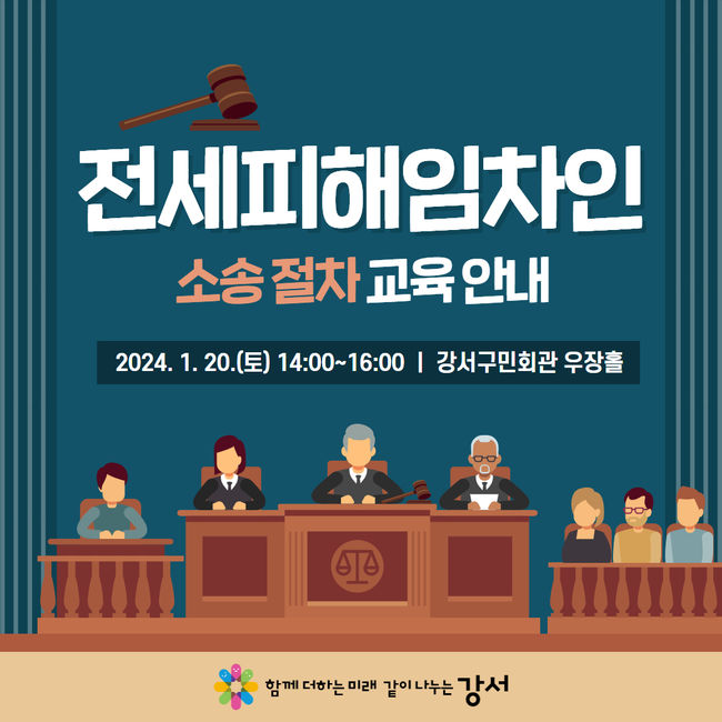 교육은 오는 20일 오후 2시부터 강서구민회관 우장홀에서 2시간 동안 진행되며, 전세피해 소송 수행 절차에 도움이 필요한 사람이면 누구나 참여할 수 있다.