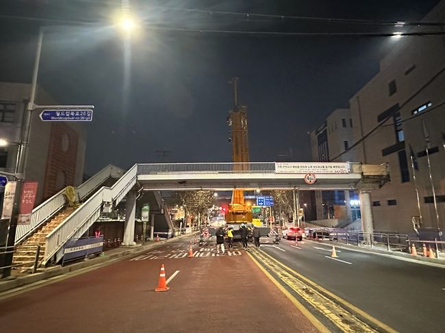 철거 중인 서울중동초등학교 앞 보도육교 모습