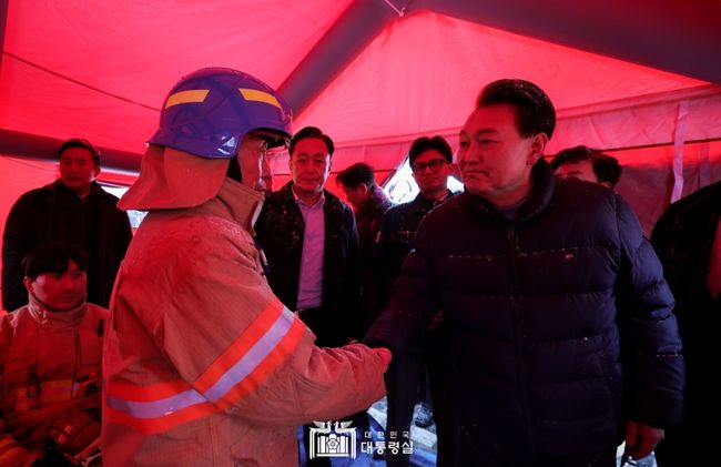 윤 대통령은 또 "화재를 진압 할때 여러분 안전이 중요하다"고 강조하며 "여러분의 안전을 위해 장비 등을 전폭적으로 지원하겠다. 여러분도 항상 안전에 유념해 달라"고 당부했다.