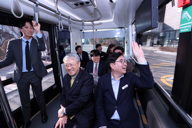 사진은 박일하 동작구청장, 장범식 숭실대 총장, 정인태 롯데정보통신 nDX 사업본부장 등 주요 관계자들이 버스 시승식에 참여한 모습.